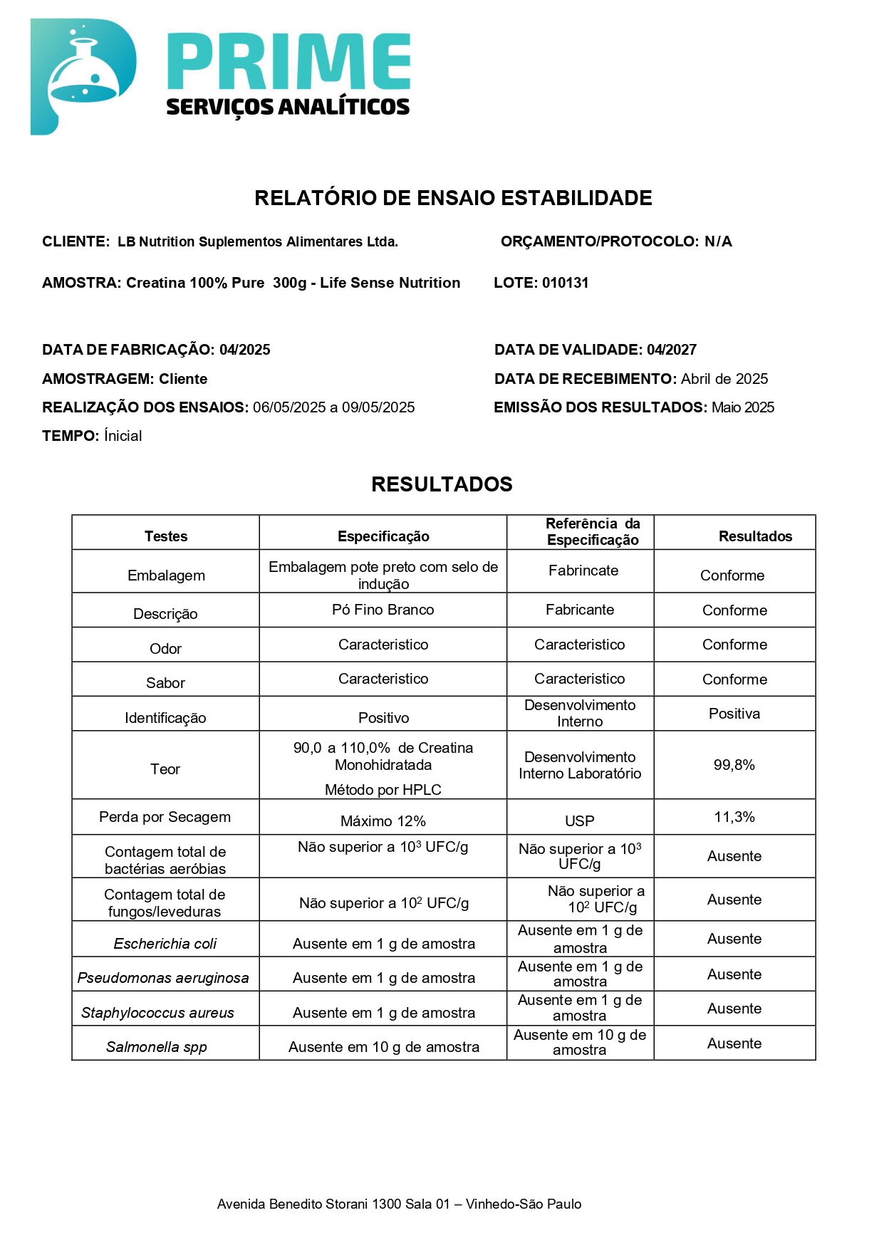 Laudo de aprovação - Creatina 100% pura